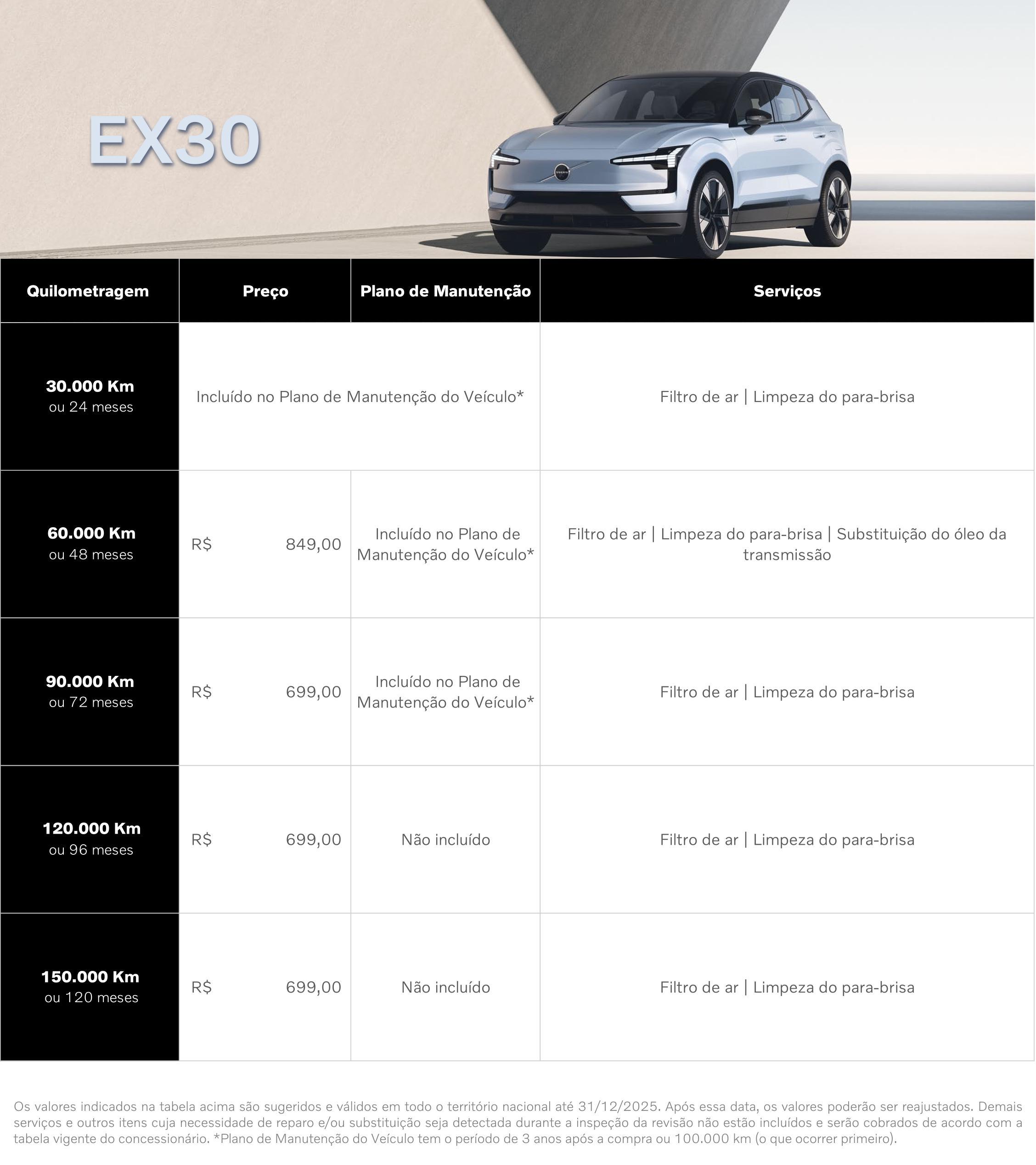 Acesse a página correspondente ao seu Volvo e tenha acesso aos serviços realizados os preços, fixos, de cada uma das revisões até 150mil quilometros.