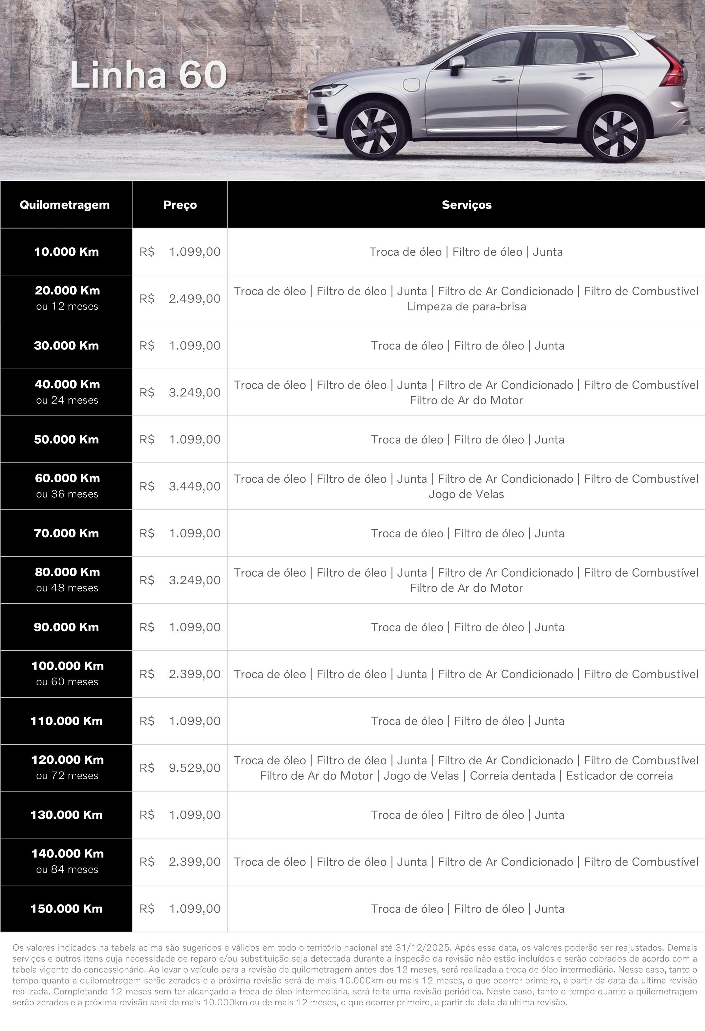 Saiba os valores de cada revisão para seu S60, V60 ou XC60.
